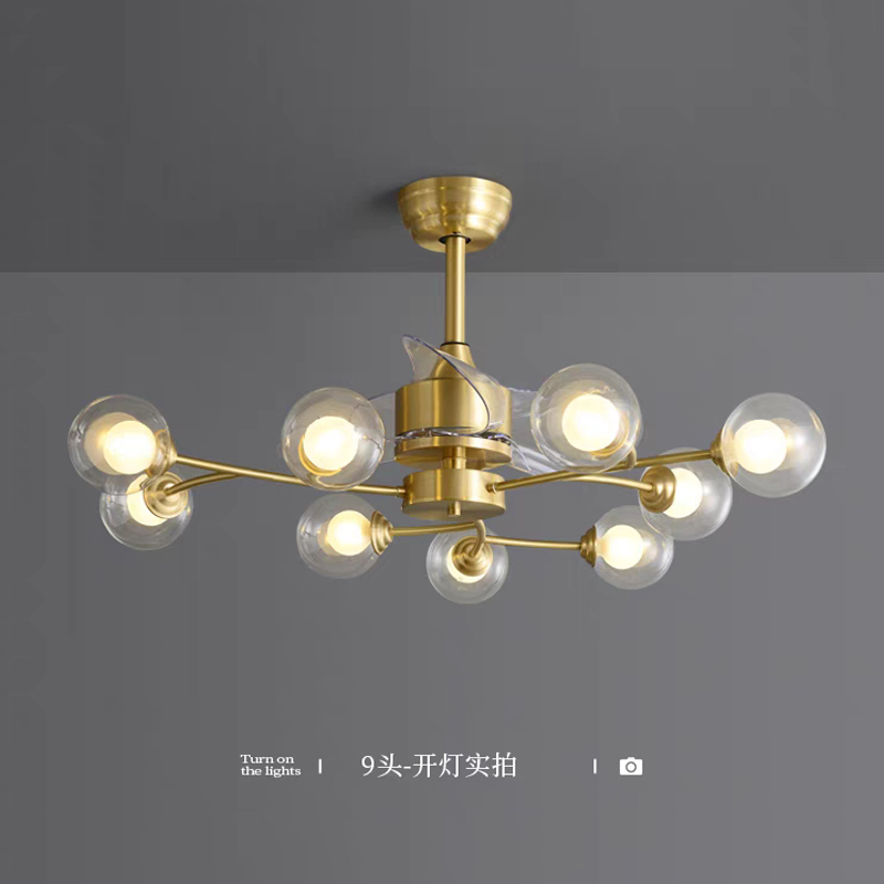 全铜风扇灯 A4-9908 北欧家用轻奢水晶餐厅吊扇灯全铜风扇灯现代简约客厅静音变频风扇灯 全铜灯体+玻璃灯罩 不含G9光源 询价下单