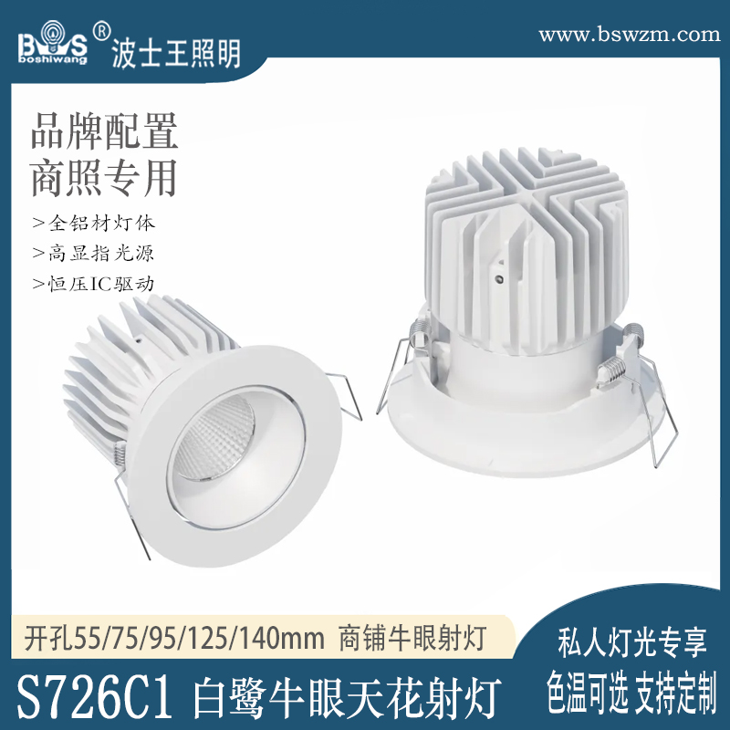 S726C1白鹭 牛眼射灯 工程定制款 店铺专用射灯 高纯度全铝压铸灯体 表面颜色白色 嵌入式可调射灯 格锐光学透镜 光束角可选24度/38度 色温可选 支持智能定制