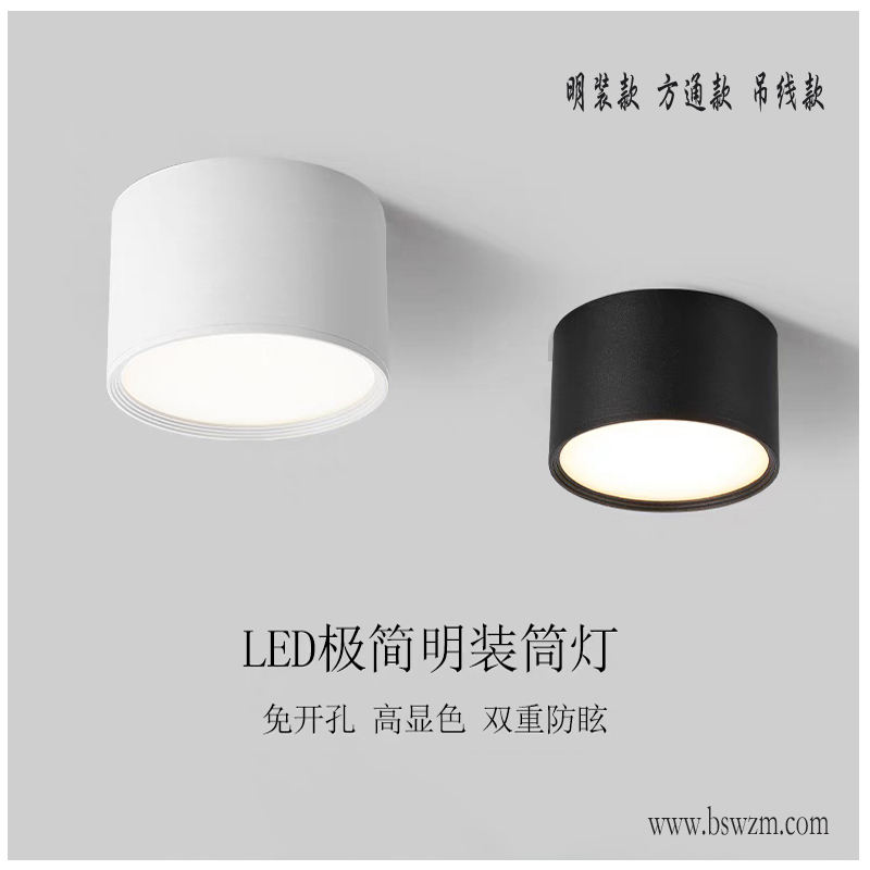 明装贴片筒灯 方通/明装/吊线款高纯度全铝外壳 颜色可选砂白/黑色 表面喷粉工艺 高亮贴片光源 波士王隔离IC驱动 色温可选 支持定制